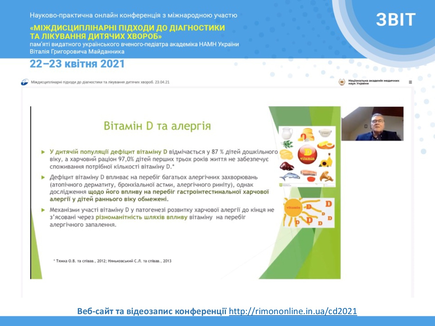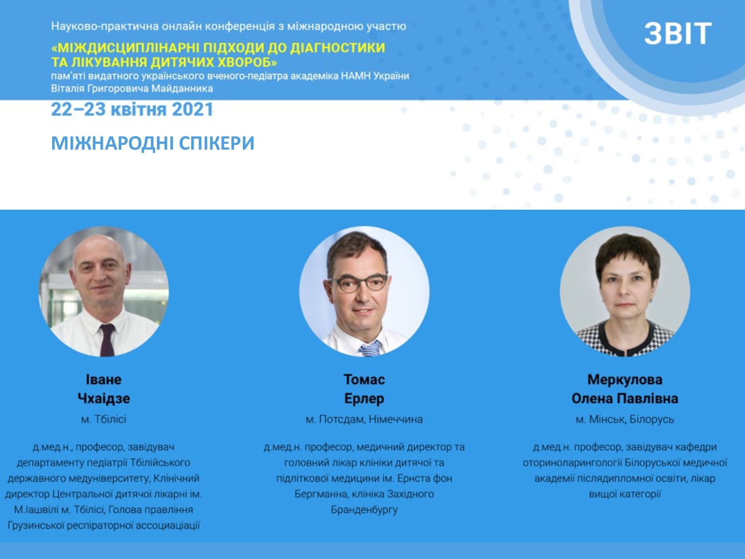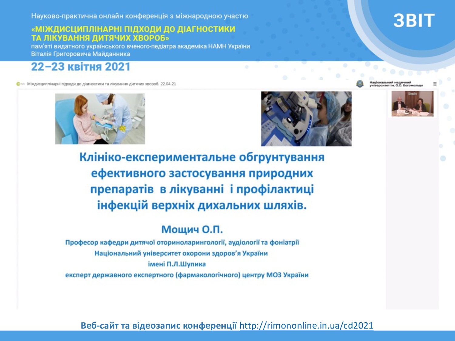 Міністерство охорони здоров'я України, Національна академія медичних наук України та Національний медичний університет ім. О.О. Богомольця запрошує Вас взяти активну участь у роботі Науково-практичній онлайн конференції з міжнародною участю «Міждисциплінарні підходи до діагностики та лікування дитячих хвороб», яка присвячена пам'яті видатного українського вченого-педіатра академіка НАМН України Віталія Григоровича Майданника.